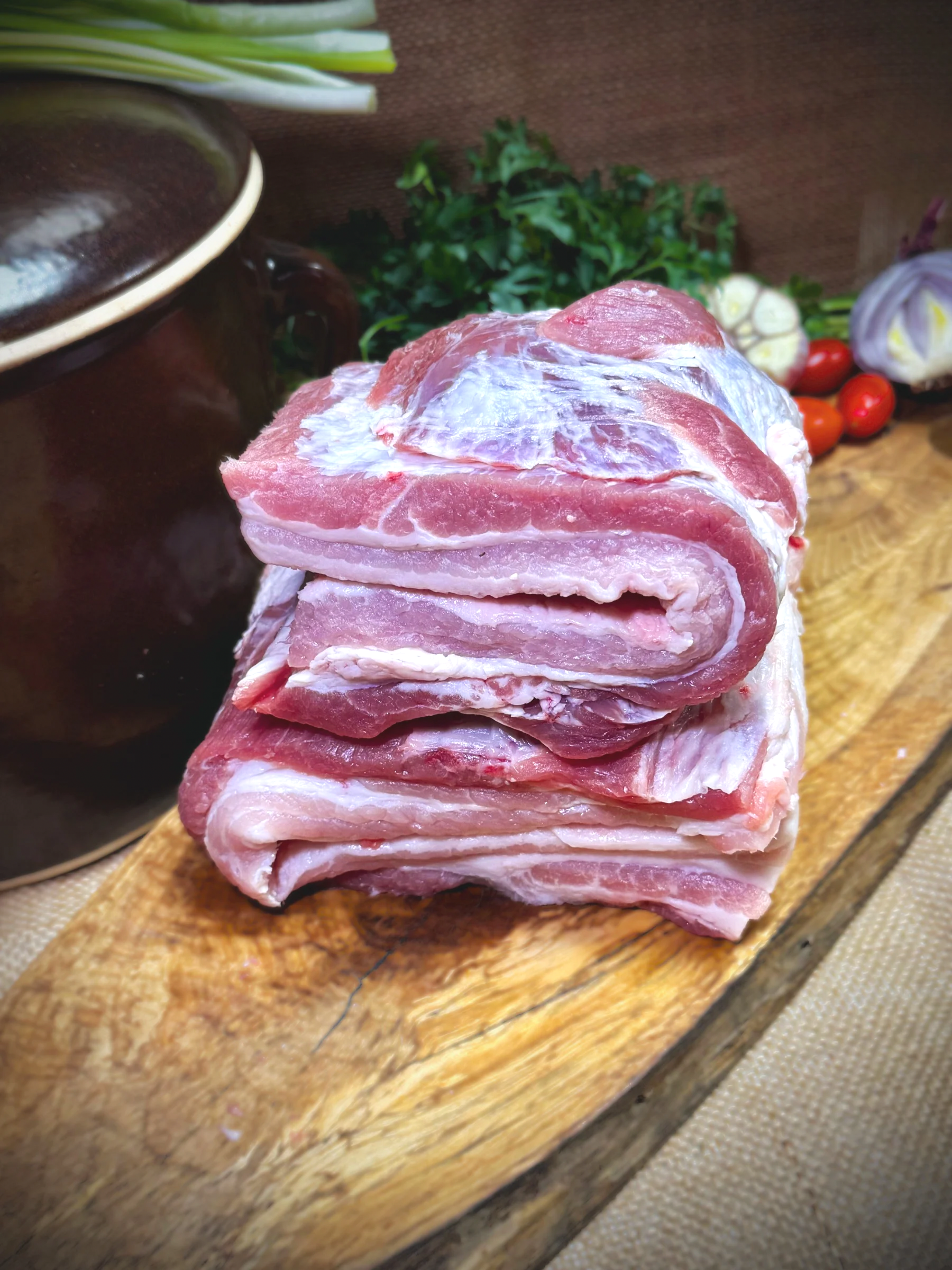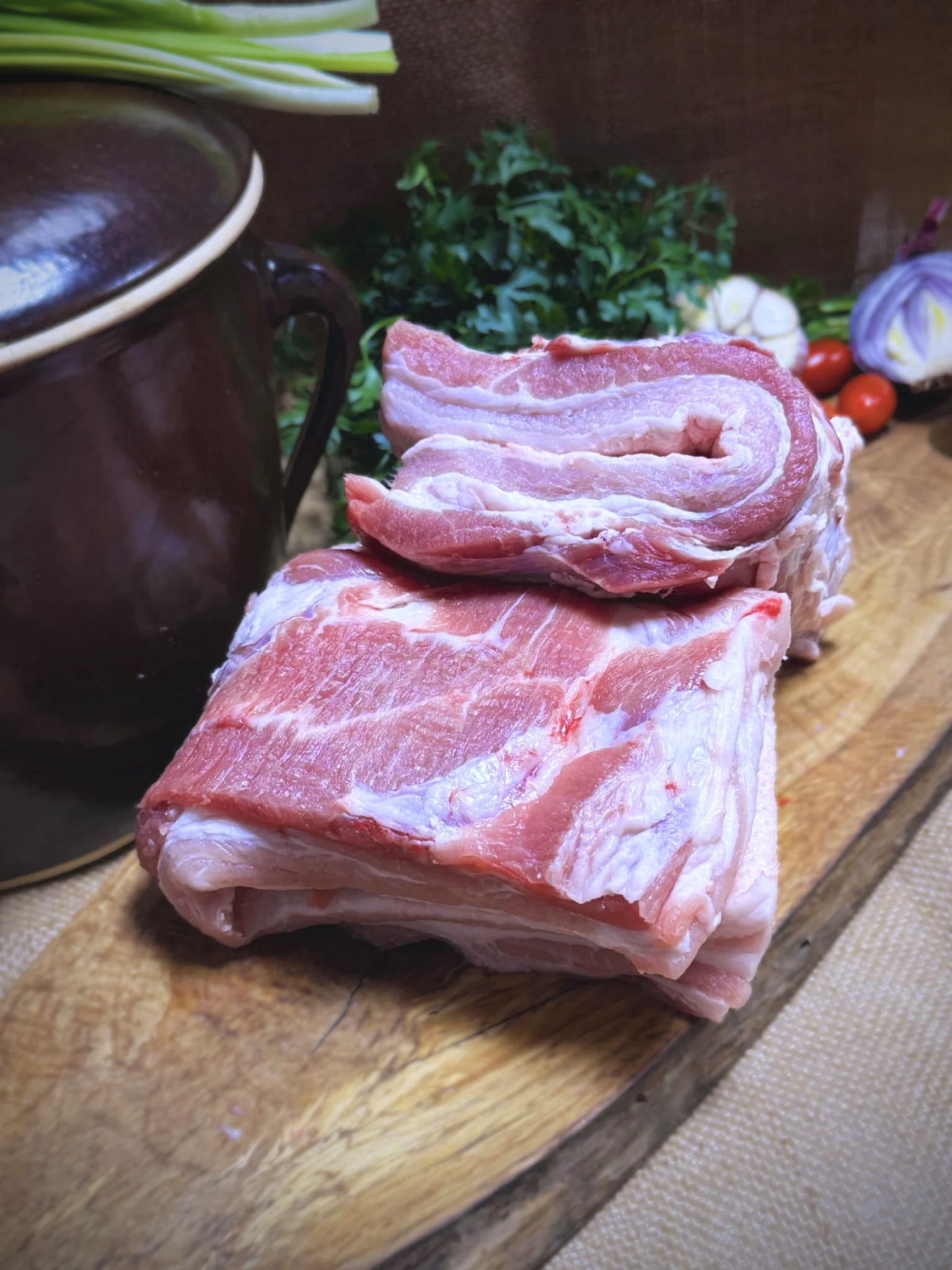 Surowy boczek bez skóry 1 kg – Naturalne mięso z lokalnych i sprawdzonych hodowli, bez ulepszaczy i chemii. Doskonały wybór do pieczenia, duszenia i innych domowych potraw.