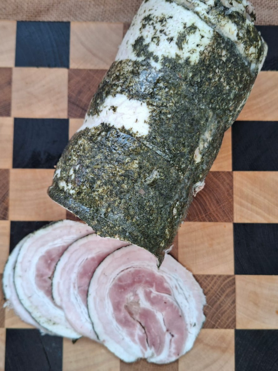Skład: boczek wieprzowy bez skóry, sól, przyprawy, żelatyna spożywcza( WIEPRZOWA), glukoza, wzmacniacz smaku: glutaminian sodu, ekstrakty przypraw, przeciwutleniacz: askorbinian sodu, substancja konserwująca: azotyn sodu.